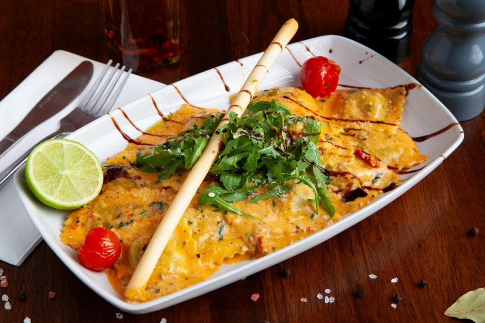 Crab and Lobster Ravioli with creamy red pesto sauce