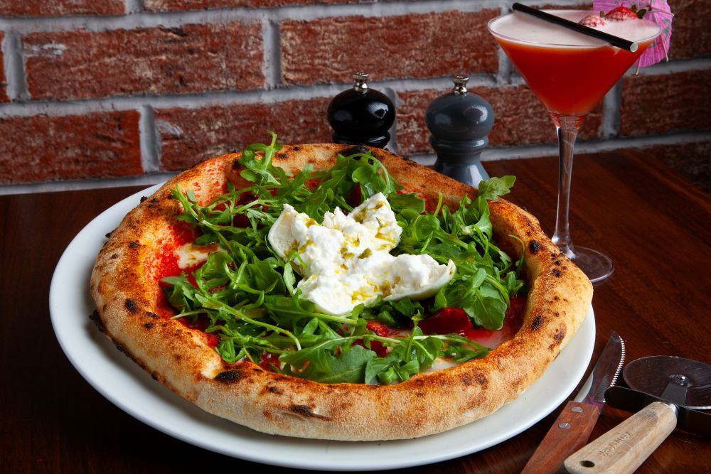 Tomato sauce, Fior di Latte cheese, Sundried tomatoes, Rocket, Burrata cheese, Basil sauce and balsamic